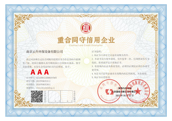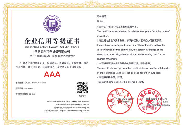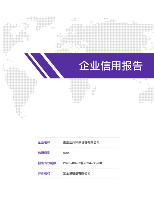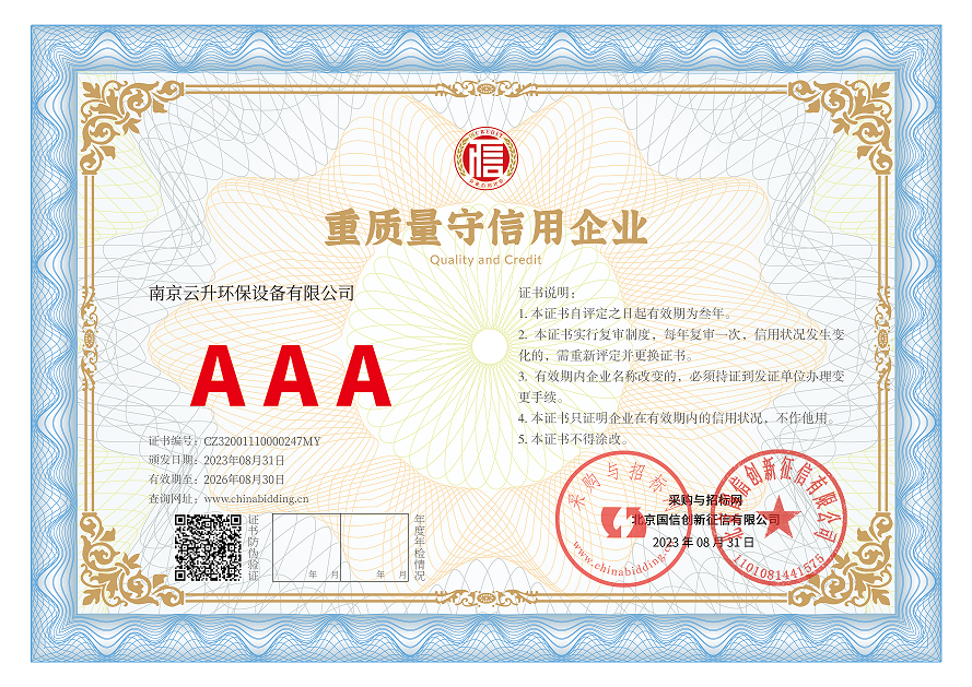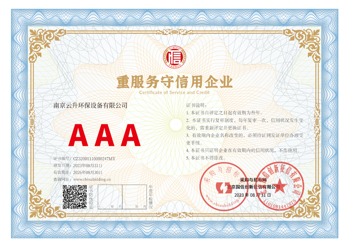 南京云升環(huán)保設備有限公司全體員工愿以環(huán)境保護為己任,以市場為導向,以優(yōu)質服務為原則,嚴格的管理、先進的生產工藝、至上的品質、完善的售前售后服務,與廣大新老用戶攜手并進,共鑄輝煌。公司已通過ISO9001:2000質量管理體系標準認證,成為江蘇省高新企業(yè),并進行不斷的技術改進和創(chuàng)新,為客戶和合作伙伴提供滿意的產品。